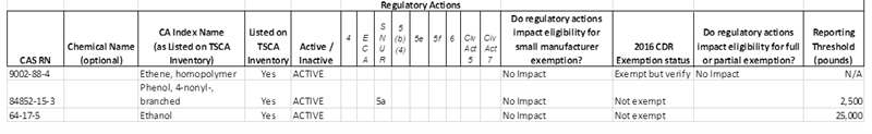 - whether they were subject to specific TSCA regulatory actions in 2016;