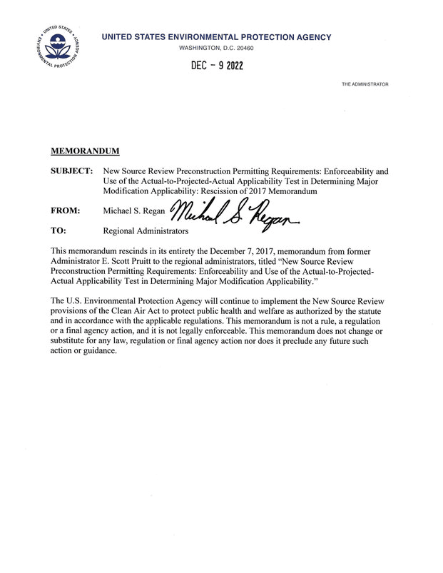 | On December 9, 2022, EPA Administrator Michael Regan issued “New Source Review Preconstruction Permitting Requirements: Enforceability and Use of the Actual-to-Projected-Actual Applicability Test in Determining Major Modification Applicability: Rescission of 2017 Memorandum.” As its title states, the December 9, 2022, memorandum rescinds “in its entirety” former Administrator Pruitt’s memorandum of the same name issued on December 7, 2017. The net effect is to remove any impediments on enforcing major NSR applicability that the Pruitt memorandum may have imposed. Read more by clicking here. |