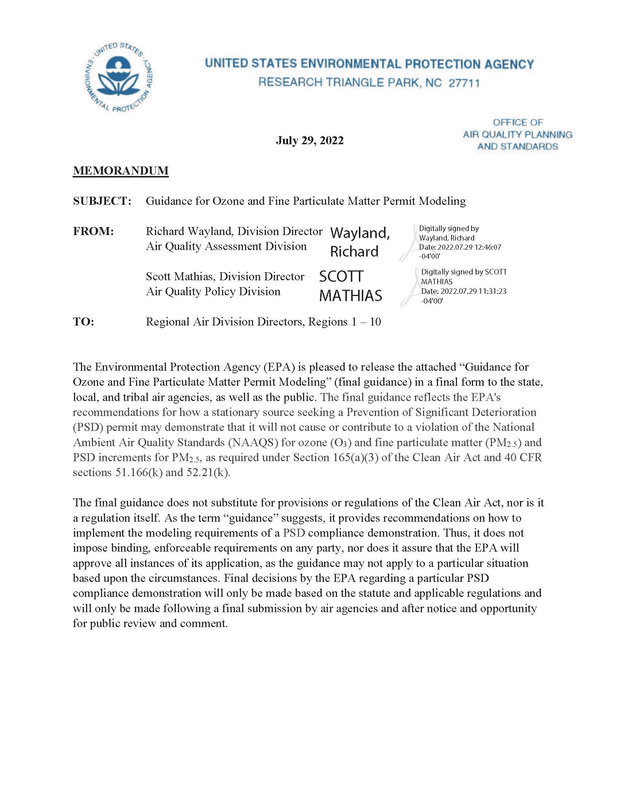 On July 29, 2022, EPA’s Air Quality Assessment Division and Air Quality Policy Division jointly issued new guidance, Guidance for Ozone and Fine Particulate Matter Permit Modeling, addressing how in final form to state, local and tribal permitting authorities and the public. The guidance sets forth “EPA’s recommendations for how a stationary source seeking” a PSD permit “may demonstrate that it will not cause or contribute to a violation” of the Ozone NAAQS, the PM2.5 NAA…